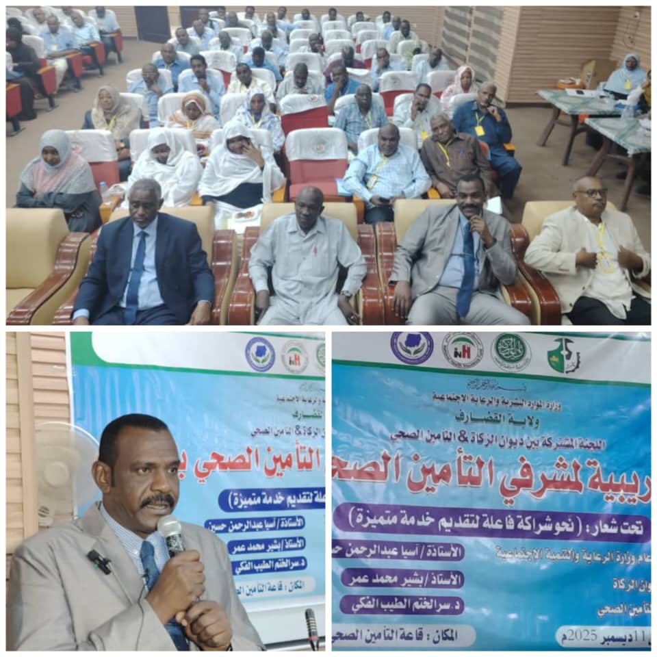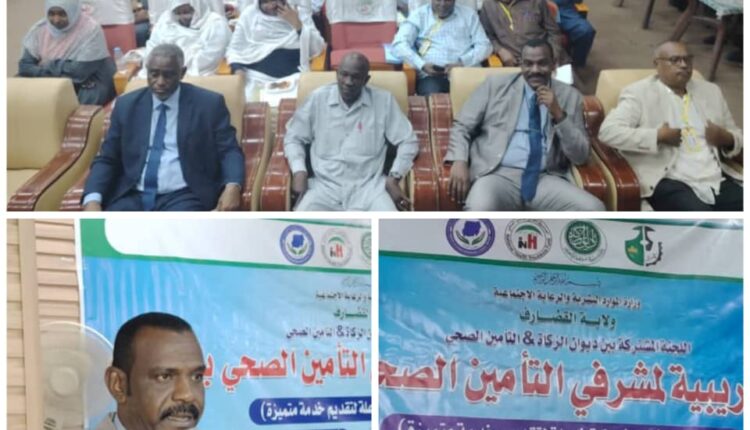 انعقدت بقاعة التأمين الصحي بولاية القضارف ورشة تدريبية لمشرفي التأمين الصحي بالمحليات، نظّمتها اللجنة المشتركة بين ديوان الزكاة والتأمين الصحي تحت شعار “نحو شراكة فاعلة لتقديم خدمة مميزة”، وذلك برعاية مدير عام وزارة الرعاية والتنمية الاجتماعية الأستاذة آسيا عبد الرحمن، وبحضور ممثل ديوان الزكاة الاتحادي الأستاذ كمال محمد محمود، وإشراف الأمين العام لديوان الزكاة بالولاية الأستاذ بشير محمد عمر، والمدير العام للتأمين الصحي الدكتور سر الختم الطيب الفكي.