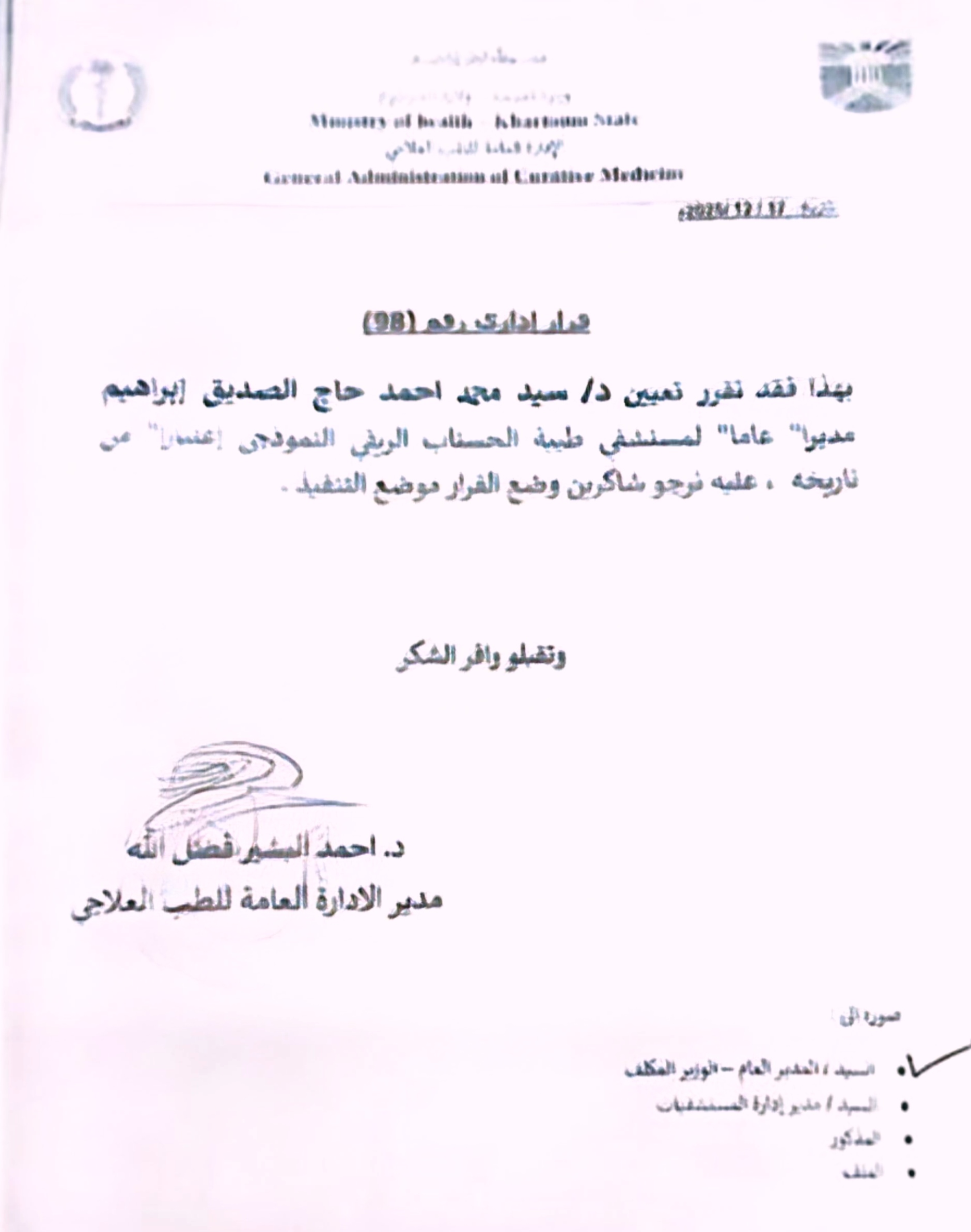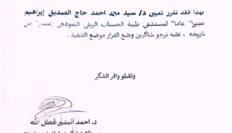 ويأتي القرار ضمن خطط الوزارة لتطوير المرافق الصحية الطرفية، ودعم النظام الصحي عبر توفير خدمات تشخيصية وعلاجية متكاملة تسهم في تخفيف الضغط على المستشفيات المركزية وتحقيق العدالة في تقديم الخدمات الصحية. وقضى القرار بتعيين دكتور سيد محمد أحمد حاج الصديق مديراً عاماً للمستشفى