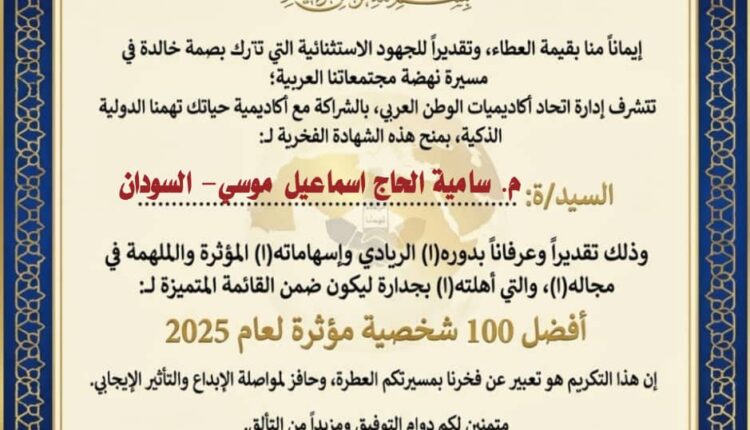 اتحاد أكاديميات الوطن العربي يكرّم المهندسة سامية الحاج إسماعيل موسى ضمن أفضل 100 شخصية مؤثرة لعام 2025م