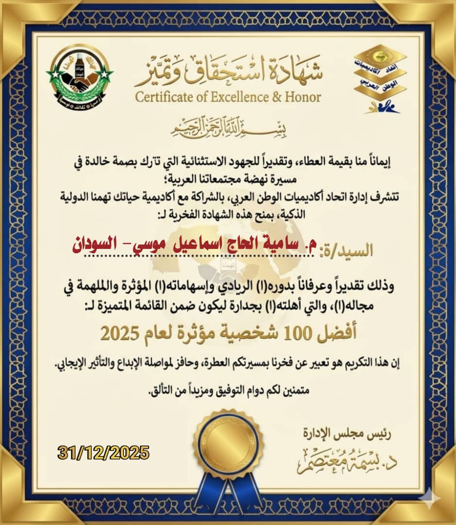 كرّم اتحاد أكاديميات الوطن العربي، بالشراكة مع أكاديمية حياتك تهمنا الدولية الذكية، المهندسة سامية الحاج إسماعيل موسى من جمهورية السودان، بمنحها شهادة استحقاق وتقدير، وذلك تقديراً لجهودها الاستثنائية وإسهاماتها الرائدة والمؤثرة في مجال عملها، والتي كان لها بالغ الأثر في خدمة المجتمع ودعم مسيرة النهضة والتنمية بالمجتمعات العربية.