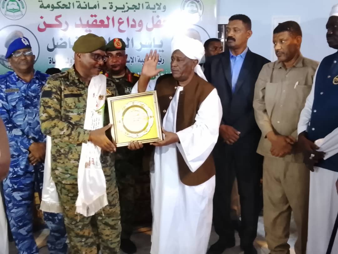 *◆-وأكد لدى مخاطبته برنامج تكريم ووداع العقيد الركن ياسر الصادق، مدير شعبة إستخبارات الفرقة الأولى مشاة بمدني اليوم، جسارة المؤسسة العسكرية، مثمنًا جهود المحتفى به وإسهامه ضمن الآخرين في تحرير والدفاع عن تراب الولاية..*