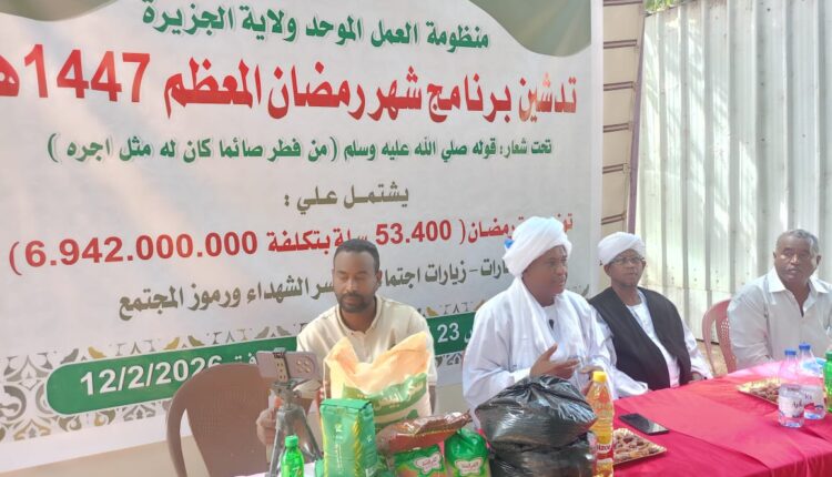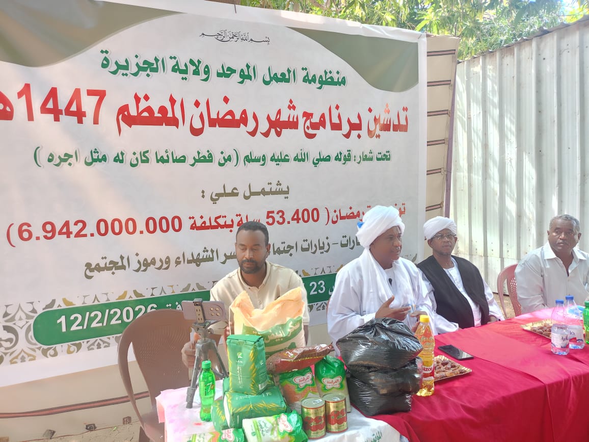 دشنت منظومة العمل الموحد بولاية الجزيرة، ظهر اليوم، برنامج شهر رمضان المعظم، مستهدفة أكثر من (53,400) أسرة بتكلفة قاربت سبعة مليارات جنيه، في إطار جهودها لدعم الشرائح المتأثرة بالظروف الراهنة.