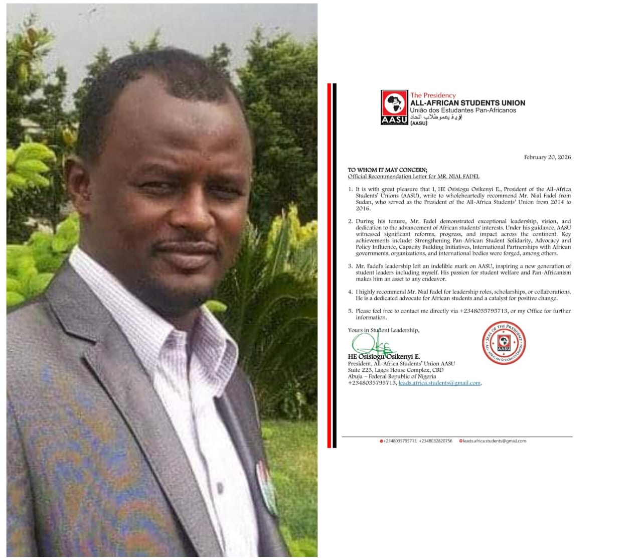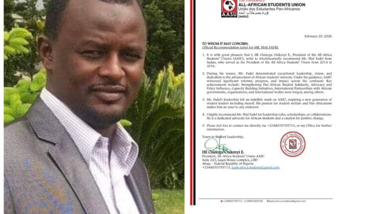 أصدرت رئاسة اتحاد طلاب عموم أفريقيا خطاب توصية رسميًا بحق القيادي السوداني النيل الفاضل محمود ، مشيدةً بدوره البارز خلال فترة رئاسته للاتحاد بين عامي 2014 و2016، وما حققه من إنجازات ملموسة على صعيد العمل الطلابي القاري.